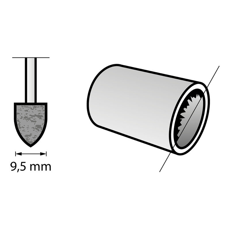 - Punta cónica de amolar de tamaño mediano. Para amolar materiales como el metal.